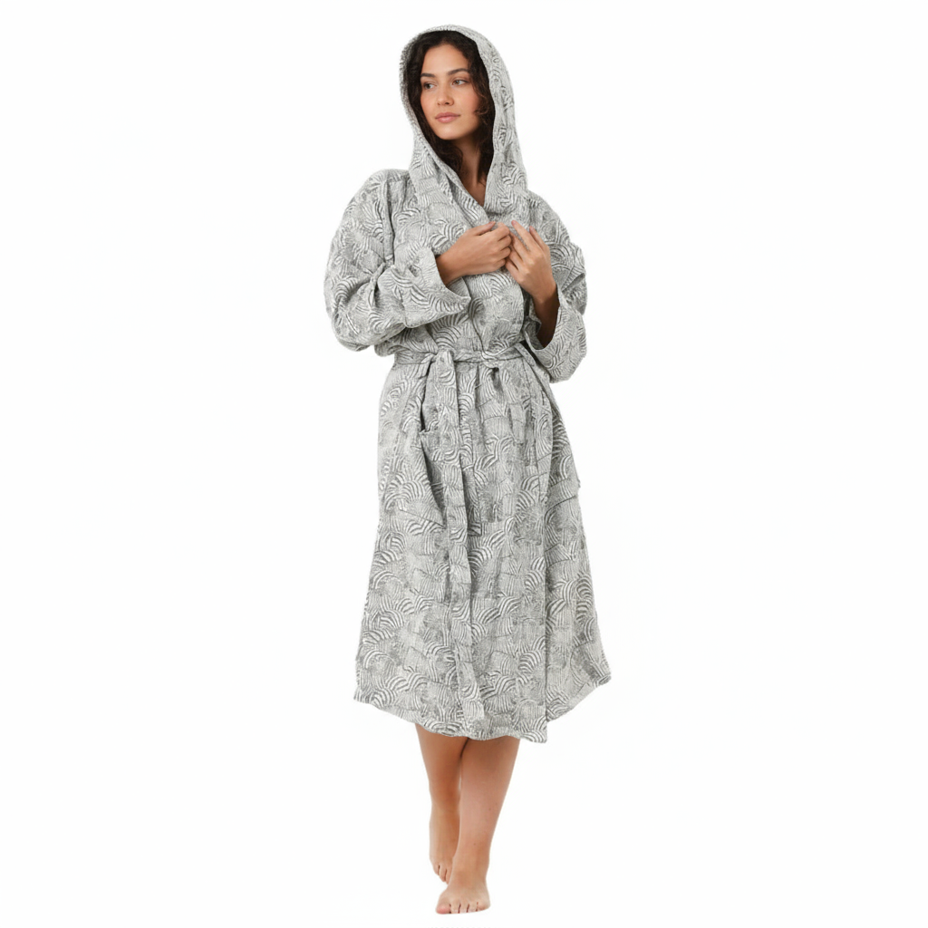Entdecken Sie den Inbegriff von Komfort mit unserem luxuriösen Mousseline-Bademantel mit Kapuze, maßgeschneidert für eine verwöhnende Umarmung. Dieses Gewand ist nicht nur ein Kleidungsstück; Es ist ein Kokon der Gemütlichkeit, gefertigt aus feinster türkischer Baumwolle, die eine sanfte Berührung auf Ihrer Haut gewährleistet. Hauptmerkmale: Ultraweicher Musselin-Stoff: Unser Bademantel besteht aus einem dreilagigen Musselin aus 100 % Baumwolle, der unvergleichliche Weichheit bietet und mit jeder Wäsche noch schöner wird. Atmungsaktiv und langlebig: Unser Musselin-Stoff ist auf Atmungsaktivität ausgelegt und sorgt dafür, dass Sie sich wohlfühlen, ohne zu überhitzen, und eignet sich daher perfekt zum Entspannen nach dem Bad oder zum Faulenzen am Pool. Umweltfreundlich, OEKO-TEX-zertifiziert: Dank unseres Engagements für Umweltschutz können Sie sicher sein, dass unsere Bademäntel strenge globale Standards für Gesundheit und Sicherheit erfüllen. Unisex-Design: Der vielseitige Schnitt des Bademantels ist für alle geeignet und zeichnet sich durch eine entspannte Passform, eine eng anliegende Kapuze, eine Schärpe und praktische Vordertaschen aus. Adaptive Passform: Das natürlich flexible Musselin passt sich Ihrem Körper an und sorgt für ein individuelles Tragegefühl, das sich Ihren Bewegungen anpasst. Schnell trocknend und äußerst saugfähig: Erleben Sie die Schnelltrocknungsfunktion unseres Bademantels, die ihn für den häufigen Gebrauch unverzichtbar macht. Stilvolle Muster und Praktikabilität: Verziert mit einzigartigen Tiermustern kombiniert es Stil mit Funktionalität, einschließlich einfacher Lagerung und hoher Saugfähigkeit. Größe und Passform: Detaillierte Größeninformationen finden Sie auf den Fotos. Hinweis: Die Größe kann innerhalb von ±5 % variieren. Ideal zum bequemen Abtrocknen zu Hause, am Strand oder nach einem erholsamen Spa-Tag. Begleitet Sie während Ihrer Yoga- oder Fitnessstudio-Sitzungen für eine schnelle, gemütliche Überdeckung. Pflegehinweise: Schonwaschgang bei 30 °C, um die Unversehrtheit der Fasern des Bademantels zu erhalten. Verwenden Sie ein Waschmittel für farbige Textilien. Vermeiden Sie Bleichmittel und optische Aufheller, um die Farben lebendig zu halten. Hüllen Sie sich in den Luxus unseres Mousseline-Bademantels mit Kapuze und verwandeln Sie Ihren Alltag in Momente verwöhnter Glückseligkeit.